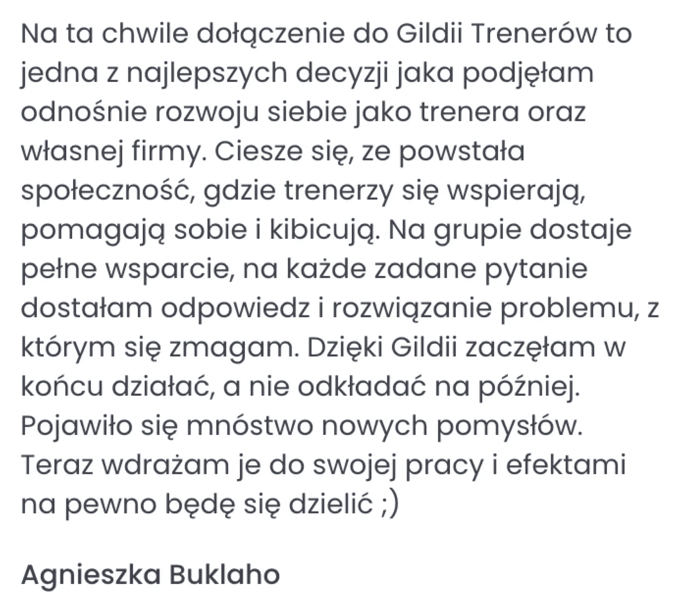 "Dzięki dołączeniu do Gildii mogłem wejść do środowiska ludzi dzięki którym rozwinąłem się jako trener oraz finansowo. Jestem w Gildii blisko rok i z miesiąca na miesiąc czerpie z tej społeczności coraz więcej.